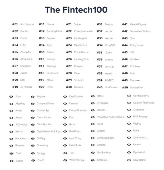 更為亮眼的是,中國企業(yè)集中于榜單的最頂端,前10強中有五家來自中國,分別是螞蟻金服、趣店、陸金所、眾安保險和京東金融。其中剛?cè)氚竦奈浵伣鸱途〇|金融分別躍升至今年榜單榜首和第10位,而趣店(趣分期)這家創(chuàng)業(yè)公司則連續(xù)兩年上榜,并由去年的第四位升至第二。
