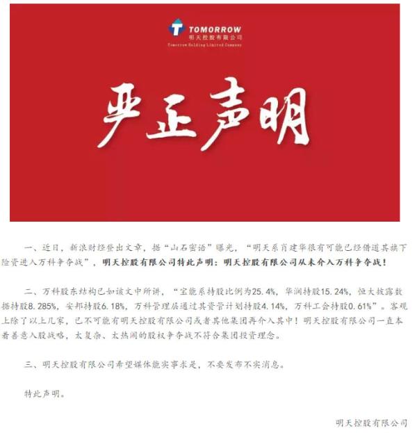 11月14日午間,關于市場上“明天系肖建華很有可能已經借道其旗下險資進入萬科爭奪戰(zhàn)”的傳聞,明天控股有限公司發(fā)布聲明稱:明天控股有限公司從未介入萬科爭奪戰(zhàn)!
