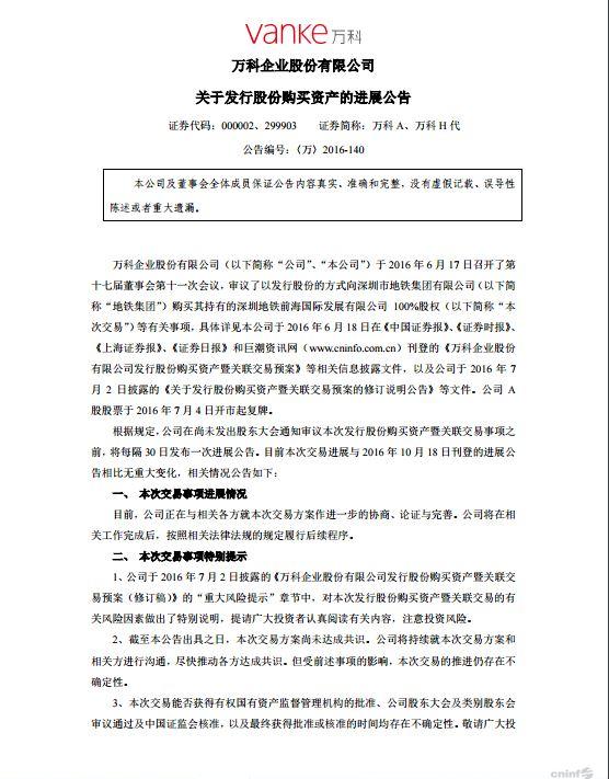 此前11月14日,萬科(000002.SZ,2202.HK)在深交所和港交所分別發(fā)布公告表示,收購深圳地鐵前海國際發(fā)展有限公司100%股權(quán)相關(guān)資料的通函原擬于11月15日或之前寄發(fā)股東,通函寄發(fā)日期預(yù)計將延遲至2016年12月31日或之前。