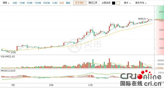 國際在線互聯(lián)網(wǎng)金融頻道:根據(jù)區(qū)塊鏈資產交易平臺火幣網(wǎng)行情顯示,截止北京時間12月20日10點左右,比特幣價格在5565元,目前最高價5583.03元,最低價5558元。