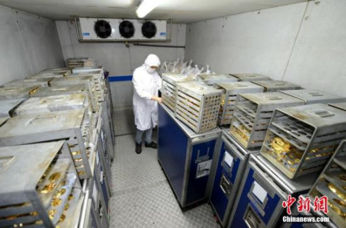 資料圖:預(yù)計(jì)距離飛機(jī)快降落時(shí),工作人員開始將食物裝入送餐車,進(jìn)入停機(jī)坪等待艙門打開,將飛機(jī)餐送入機(jī)艙中。圖為還沒(méi)有配送出去的食物都放在冷藏室。 王東明 攝