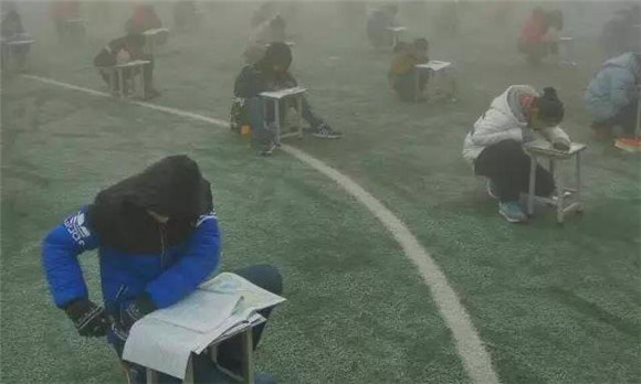 (圖為河南林州市臨淇鎮(zhèn)一中學(xué)生霧霾天在操場考試。目前該校校長已被停職。)