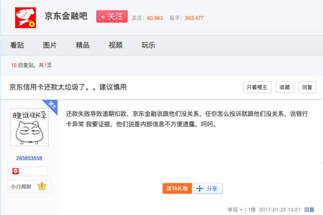 近期,有網(wǎng)友在百度貼吧爆料稱,此前用京東金融信用卡還款,出現(xiàn)還款失敗情況,并導致逾期扣款!熬〇|金融說跟他們沒有關(guān)系,任你怎么投訴就跟他們沒有關(guān)系,說是銀行卡異常。”