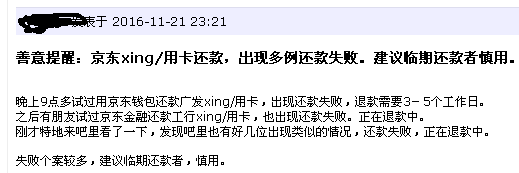 互聯(lián)網(wǎng)金融新聞中心注意到,上述網(wǎng)友所述情況并非個例。有網(wǎng)友表示,曾多次試過用京東錢包還廣發(fā)銀行信用卡,出現(xiàn)還款失敗,退款需要3-5個工作日。之后有朋友嘗試還工商銀行信用卡,也出現(xiàn)還款失敗的情況。