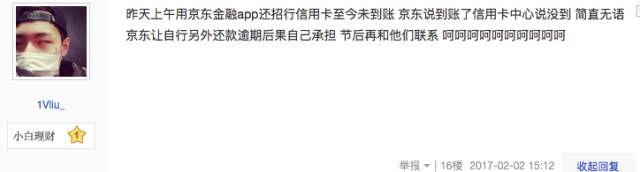還有不少網(wǎng)友提到,用京東金融還信用卡到賬時間過長!霸缟线的招行,2個小時還未到賬!薄斑招行信用卡至今未到賬,京東說到賬了,信用卡中心說未到。京東方面讓自行解決,還款逾期后果要自己承擔!