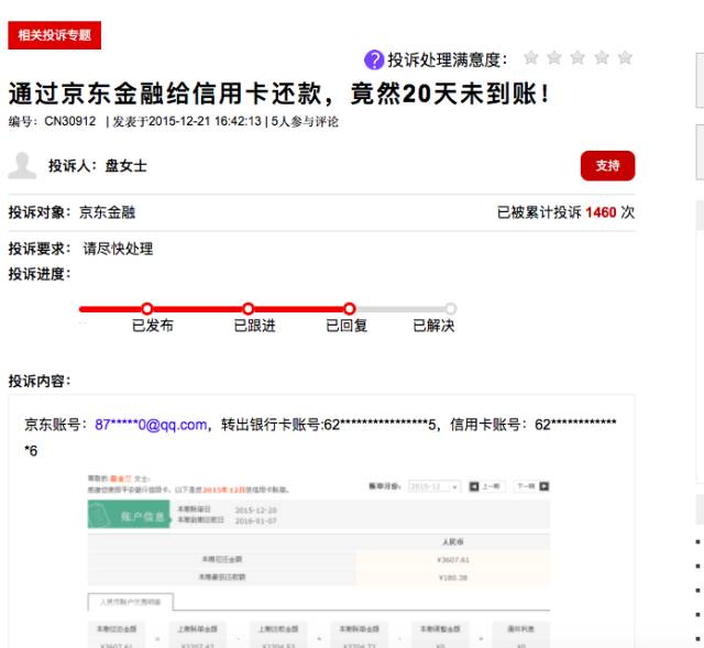 其中,一位盤女士在第三方網(wǎng)站投訴稱,“通過京東金融給信用卡還款,竟然有20天沒到賬!