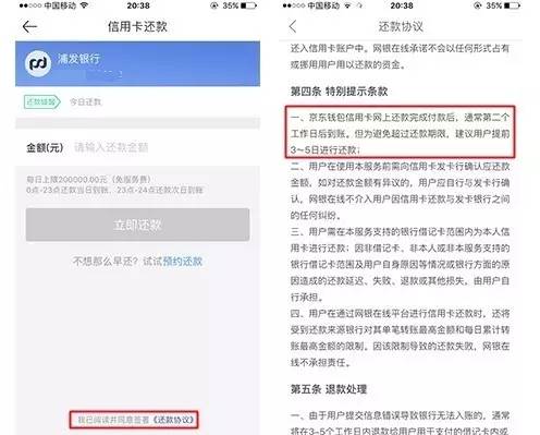 互聯(lián)網(wǎng)金融新聞中心嘗試通過京東金融APP對信用卡進行還款,設(shè)置完成時間過去一小時后仍顯示還款中,未能實現(xiàn)即時到帳。而后,互聯(lián)網(wǎng)金融新聞中心查閱京東金融APP還款協(xié)議時,在特別提示條款中發(fā)現(xiàn),協(xié)議表示,“京東錢包信用卡網(wǎng)上還款完成付款后,通常第二個工作日到賬。”