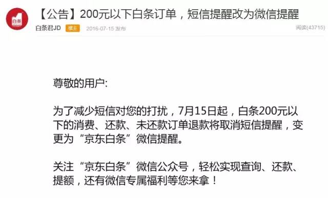 此外,京東白條2016年7月15日發(fā)布公告稱,白條200元以下的消費、還款、未還款訂單退款將取消短信提醒,變?yōu)椤熬〇|白條“微信提醒。