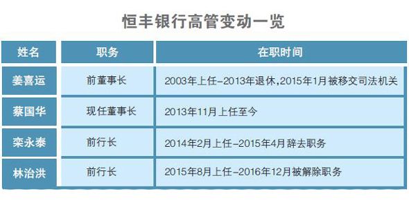 2015年1月15日,在恒豐銀行任職十年的原董事長姜喜運被開除黨籍,涉嫌犯罪問題移送司法機關(guān)依法處理。2015年4月退休的恒豐銀行前行長欒永泰在2016年9月接受媒體采訪時宣稱,姜喜運運作恒豐銀行股權(quán),獲利四五十億元,但在離任移交的時候,公司財產(chǎn)和股權(quán)都留在了恒豐銀行。