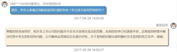 甚至有投資者以“易到司機”的身份提問。雖然趙凱一再回避,但投資者還是窮追不舍,問賈躍亭怎么看最近周航和易到樂視的爭執(zhí),會放棄易到控制權(quán)嗎?