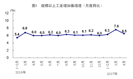 4月份,全國(guó)規(guī)模以上工業(yè)增加值同比實(shí)際增長(zhǎng)6.5%,增速比上月回落1.1個(gè)百分點(diǎn),比上年同月加快0.5個(gè)百分點(diǎn)。分經(jīng)濟(jì)類型看,國(guó)有控股企業(yè)增加值同比增長(zhǎng)5.6%,集體企業(yè)增長(zhǎng)1.9%,股份制企業(yè)增長(zhǎng)6.9%,外商及港澳臺(tái)商投資企業(yè)增長(zhǎng)5.5%。分三大門類看,采礦業(yè)增加值同比下降0.4%,制造業(yè)增長(zhǎng)6.9%,電力、熱力、燃?xì)饧八a(chǎn)和供應(yīng)業(yè)增長(zhǎng)7.8%。工業(yè)結(jié)構(gòu)繼續(xù)優(yōu)化,高技術(shù)產(chǎn)業(yè)和裝備制造業(yè)增加值同比分別增長(zhǎng)12.3%和10.3%,增速分別比規(guī)模以上工業(yè)快5.8和3.8個(gè)百分點(diǎn)。規(guī)模以上工業(yè)企業(yè)產(chǎn)銷率達(dá)到97.6%。從環(huán)比看,4月份全國(guó)規(guī)模以上工業(yè)增加值比上月增長(zhǎng)0.56%。1-4月份,全國(guó)規(guī)模以上工業(yè)增加值同比增長(zhǎng)6.7%。