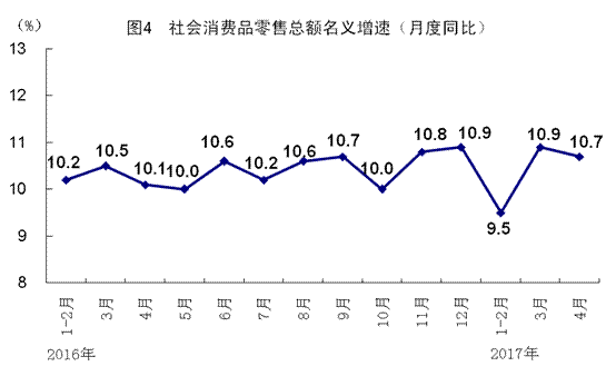 4月份,社會(huì)消費(fèi)品零售總額27278億元,同比增長(zhǎng)10.7%,增速比上月回落0.2個(gè)百分點(diǎn),比上年同月加快0.6個(gè)百分點(diǎn)。按經(jīng)營(yíng)單位所在地分,城鎮(zhèn)消費(fèi)品零售額23483億元,同比增長(zhǎng)10.4%;鄉(xiāng)村消費(fèi)品零售額3795億元,增長(zhǎng)12.6%。按消費(fèi)類型分,餐飲收入2886億元,同比增長(zhǎng)11.1%;商品零售24393億元,增長(zhǎng)10.6%,其中限額以上單位商品零售11532億元,增長(zhǎng)9.3%。從環(huán)比看,4月份社會(huì)消費(fèi)品零售總額比上月增長(zhǎng)0.79%。1-4月份,社會(huì)消費(fèi)品零售總額同比增長(zhǎng)10.2%。