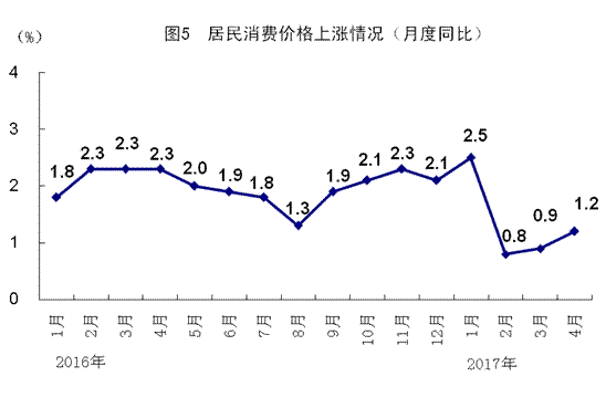 4月份,全國(guó)居民消費(fèi)價(jià)格同比上漲1.2%,漲幅比上月擴(kuò)大0.3個(gè)百分點(diǎn)。分類別看,食品煙酒價(jià)格同比下降1.8%,衣著上漲1.3%,居住上漲2.4%,生活用品及服務(wù)上漲0.8%,交通和通信上漲1.8%,教育文化和娛樂上漲2.6%,醫(yī)療保健上漲5.7%,其他用品和服務(wù)上漲3.4%。在食品煙酒價(jià)格中,糧食價(jià)格上漲1.5%,豬肉價(jià)格下降8.1%,鮮菜價(jià)格下降21.6%。4月份,居民消費(fèi)價(jià)格環(huán)比上漲0.1%。1-4月份,全國(guó)居民消費(fèi)價(jià)格同比上漲1.4%。