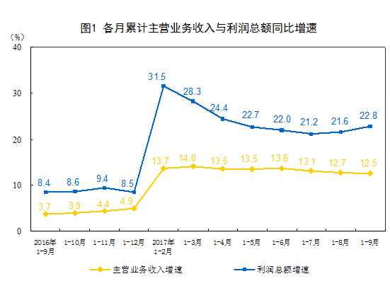 央廣網(wǎng)10月27日消息 國家統(tǒng)計局27日發(fā)布的數(shù)據(jù)顯示,2017年1-9月份,全國規(guī)模以上工業(yè)企業(yè)實現(xiàn)利潤總額55846億元,同比增長22.8%,增速比1-8月份加快1.2個百分點。