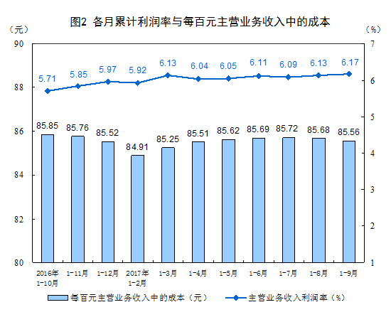 1-9月份,規(guī)模以上工業(yè)企業(yè)實現(xiàn)主營業(yè)務收入90.5萬億元,同比增長12.5%;發(fā)生主營業(yè)務成本77.4萬億元,增長12.2%;主營業(yè)務收入利潤率為6.17%,同比提高0.51個百分點。