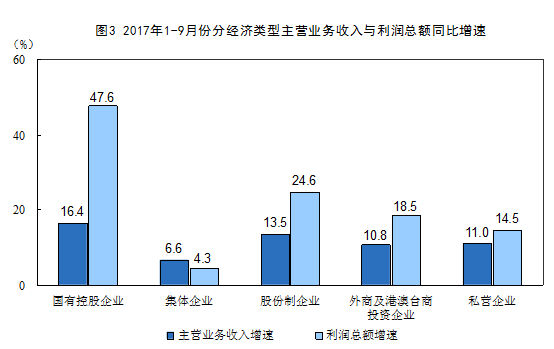 1-9月份,規(guī)模以上工業(yè)企業(yè)中,國有控股企業(yè)實現(xiàn)利潤總額12577.4億元,同比增長47.6%;集體企業(yè)實現(xiàn)利潤總額323.4億元,增長4.3%;股份制企業(yè)實現(xiàn)利潤總額39096.7億元,增長24.6%;外商及港澳臺商投資企業(yè)實現(xiàn)利潤總額13514.3億元,增長18.5%;私營企業(yè)實現(xiàn)利潤總額18285.9億元,增長14.5%。