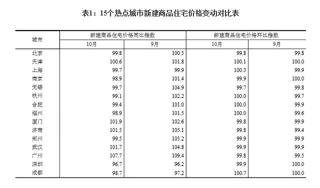 10月份,隨著“因城施策”房地產(chǎn)市場調(diào)控政策不斷深入,70個大中城市中15個熱點城市房地產(chǎn)市場總體平穩(wěn)。從環(huán)比看,9個城市新建商品住宅價格下降,降幅在0.1至0.3個百分點之間;天津、上海和成都分別上漲0.1%、0.3%和0.7%。從同比看,13個城市漲幅繼續(xù)回落,回落幅度在0.1至3.7個百分點之間。