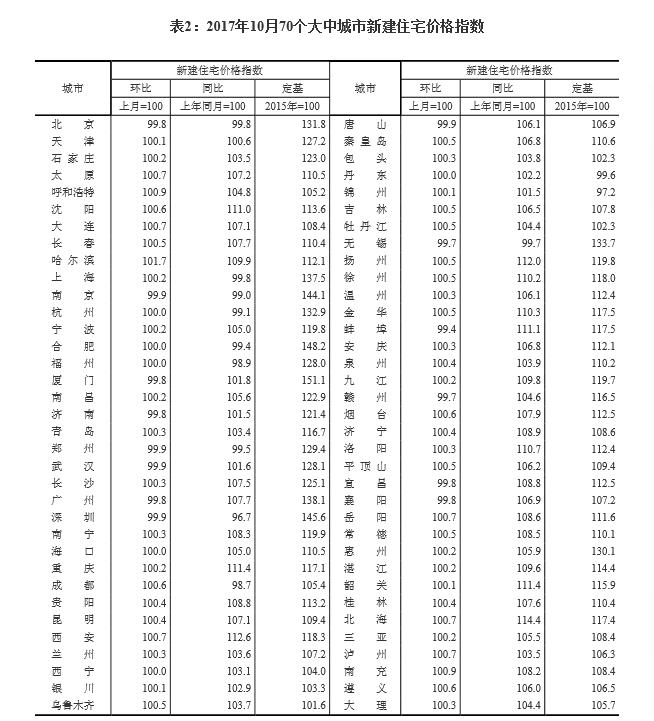 央廣網(wǎng)11月18日消息 國家統(tǒng)計局今日發(fā)布了2017年10月份70個大中城市住宅銷售價格統(tǒng)計數(shù)據(jù)。對此,國家統(tǒng)計局城市司高級統(tǒng)計師劉建偉進(jìn)行了解讀。