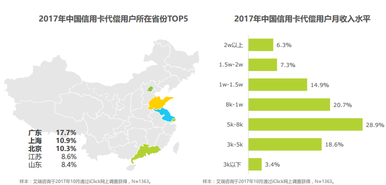 《報告》顯示,信用卡代償用戶多位于東部經(jīng)濟(jì)和教育發(fā)達(dá)地區(qū),廣東、上海、北京等省市最具代表性。在收入方面,超半數(shù)用戶月收入集中在5000-10000元的范圍內(nèi),收入水平整體較好。