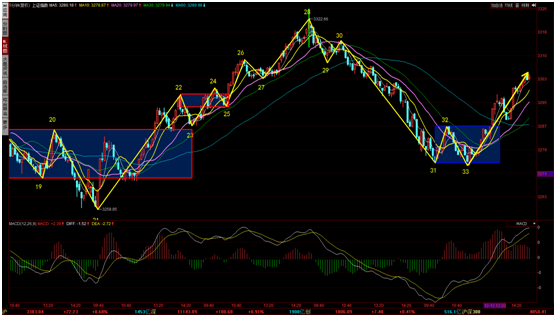 以上證指數(shù)為例,在昨天解盤中,我們提示大家當(dāng)前即使出現(xiàn)了30分鐘的二買,還不構(gòu)成我們加倉(cāng)條件。從今天上證指數(shù)30分鐘圖形來看,今天雖然有可能產(chǎn)生30分鐘一筆反彈,但從3254點(diǎn)一買起來的一筆反彈拉下黃金分割,二買回調(diào)幅度過深,超過了0.382。對(duì)于回調(diào)幅度過深的二買,我們課程中講過,是需要防止做成弱勢(shì)的中樞延伸。
