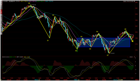 而從創(chuàng)業(yè)板來看,創(chuàng)業(yè)板當(dāng)前也是弱勢(shì)的30分中樞震蕩,也是藍(lán)色的下跌中樞,和上證指數(shù)類似,也是要關(guān)注是否能夠擺脫當(dāng)前83-86藍(lán)色的下跌中樞。如果始終擺脫不了,做完弱勢(shì)震蕩之后,依然要防范指數(shù)再度向下。