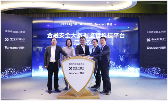 。▓D為北京市金融工作局、中關(guān)村銀行及騰訊公司領(lǐng)導(dǎo)共同發(fā)布金融安全大數(shù)據(jù)監(jiān)管平臺)