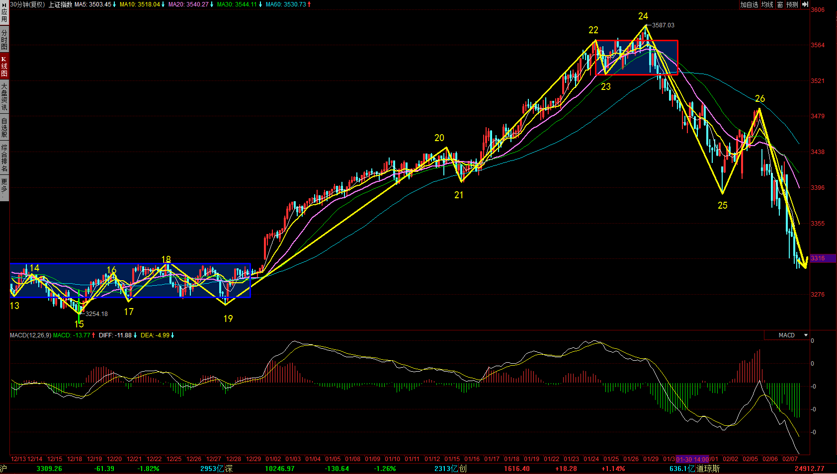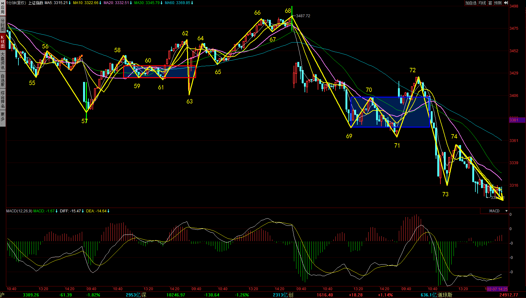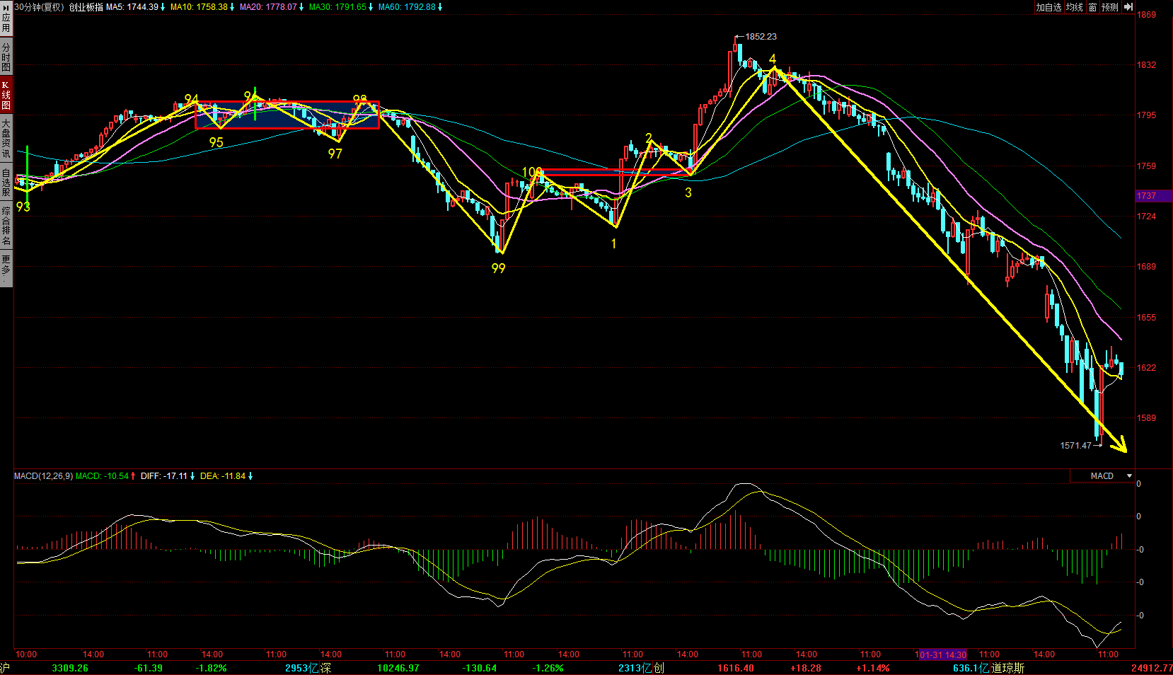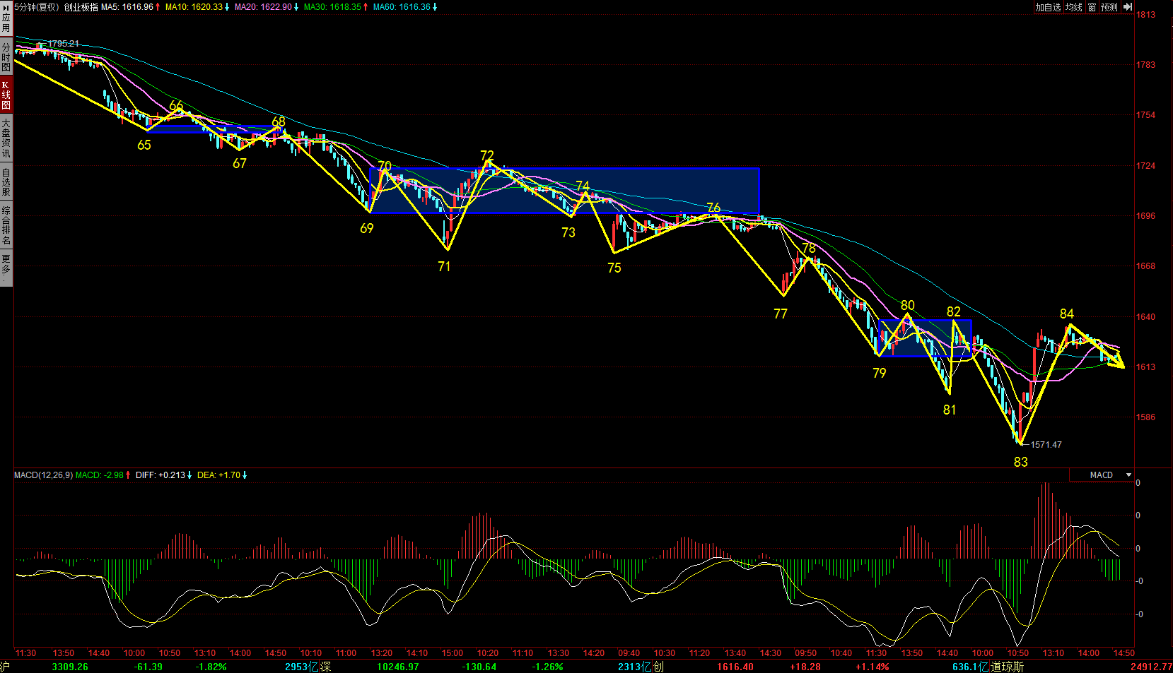 而創(chuàng)業(yè)板指數(shù)這邊,早盤(pán)很快就把跳空缺口完全回補(bǔ)掉,隨后82-83創(chuàng)出了階段新低。但是這一筆對(duì)應(yīng)的MACD面積要比76-79小,所以構(gòu)成了5分鐘級(jí)別的背馳段,隨后的快速拉回就構(gòu)成了今天的探底回升。從走勢(shì)結(jié)構(gòu)預(yù)估,創(chuàng)業(yè)板指數(shù)這里大概率是要改變一下下跌速度,因?yàn)橹跋碌俣确浅?,所以這里很有可能會(huì)構(gòu)筑一個(gè)30分鐘級(jí)別的下跌中樞然后再來(lái)選擇方向。這一點(diǎn)一定要說(shuō)清楚,對(duì)日線下跌一筆而言,目前沒(méi)有結(jié)束,這里這是可能改變過(guò)去下跌比較快的速度,這里請(qǐng)所有同學(xué)知悉。