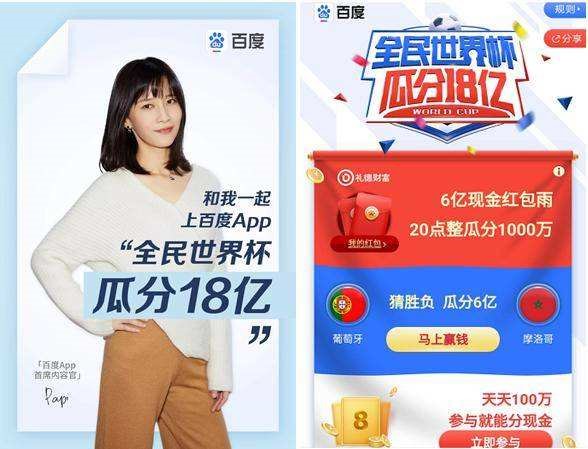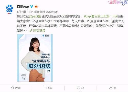 6月19日上午,百度App官方微博宣布,Papi醬正式擔任百度App首席內(nèi)容官,并在世界杯期間特定時間段設置搶現(xiàn)金紅包活動,預計在全天各時段安插搶18億現(xiàn)金紅包活動。