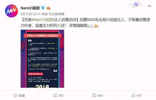 5月15日,百度宣布進軍短視頻,旗下產(chǎn)品Nani小視頻進行公開招募創(chuàng)作者,包括個人作者和機構(gòu)。而Papi醬的Papitube,就是一家頗為成熟的MCN機構(gòu)(Multi-Channel Network),旗下博主涵蓋美妝測評、美食、萌寵、旅行等多方面。公開報道顯示,截至6月初,Papitube已經(jīng)簽約了60多位視頻博主。