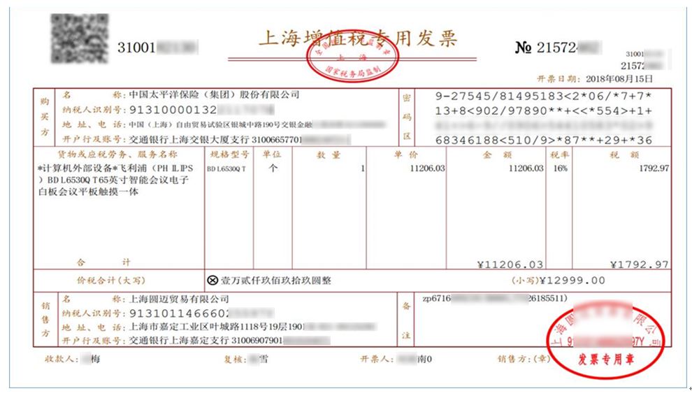 京東與中國(guó)太保聯(lián)合展示開(kāi)具的區(qū)塊鏈電子化增值稅專用發(fā)票