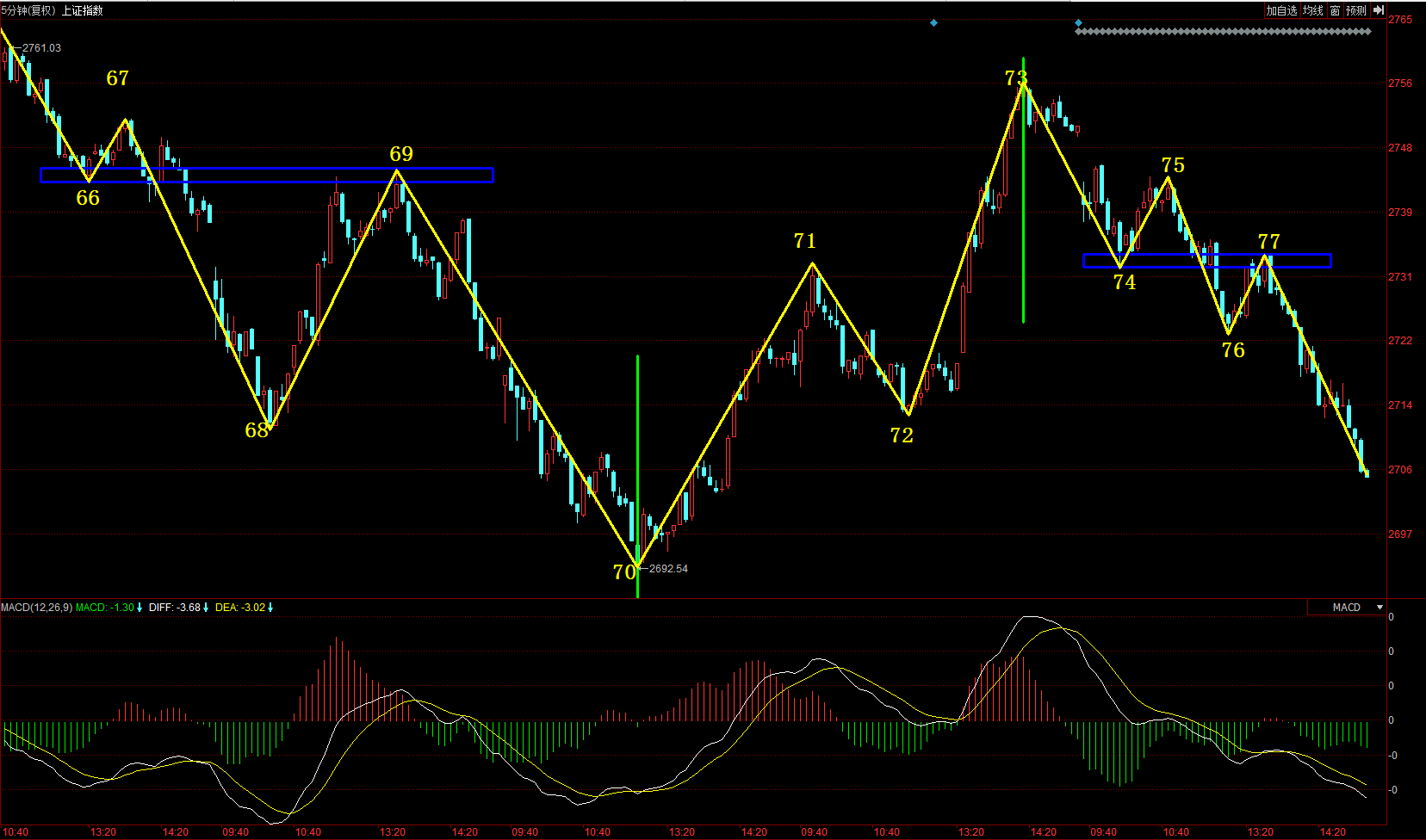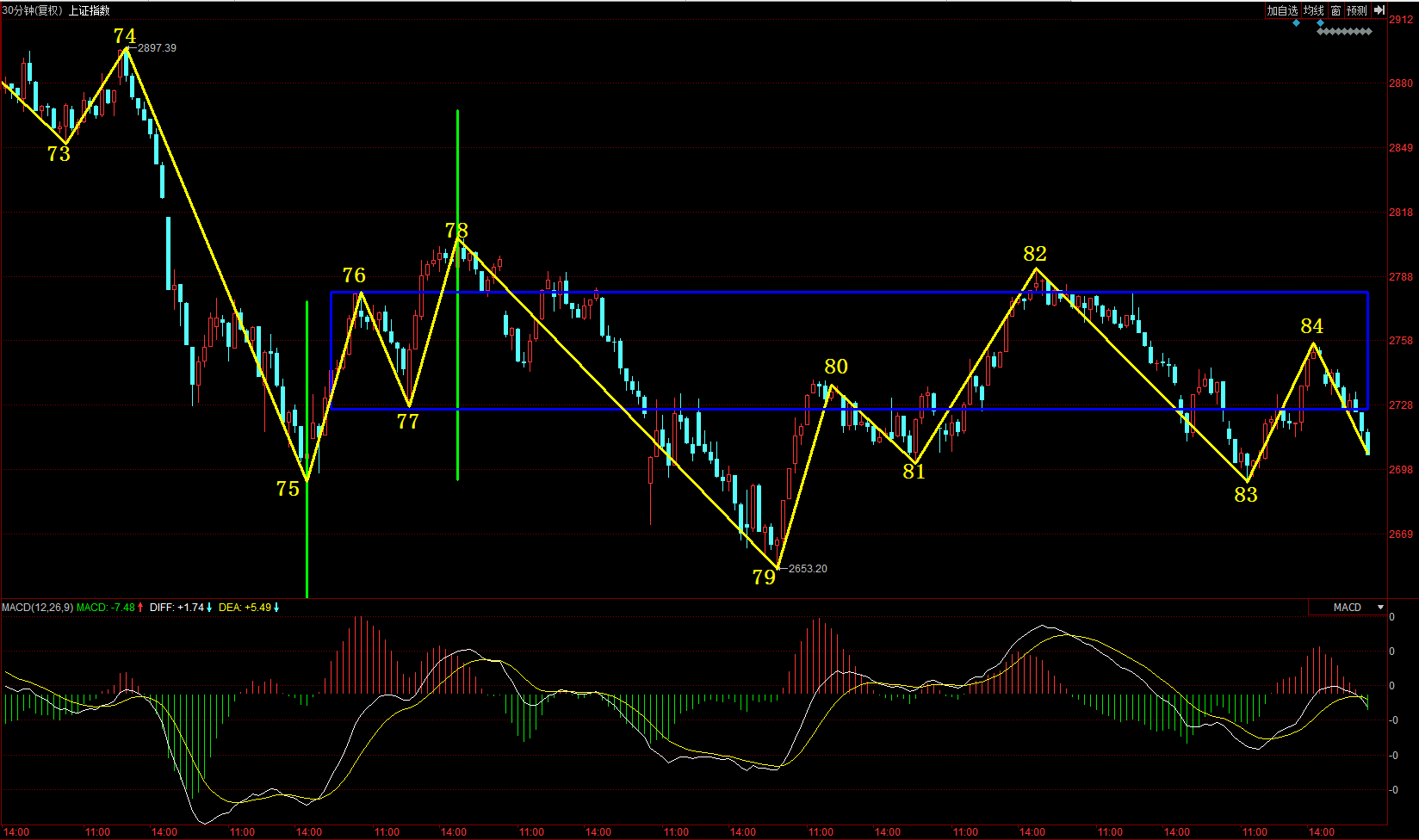 在昨天的解盤中,我們提示大家雖然指數(shù)30分鐘拉回之前75-78中樞,目前依然為30分鐘的中樞震蕩結(jié)構(gòu),尚不夠成我們加倉條件,依然保持三成倉位。以上證指數(shù)為例,今天指數(shù)30分鐘84號點再度向下出現(xiàn)了一筆調(diào)整,目前依然是圍繞75-78中樞的弱勢震蕩。接下來指數(shù)存在兩種可能演變,一種就是繼續(xù)圍繞該中樞反復震蕩。還有一種就是繼續(xù)向下,跌破83號點,那么前期低點79號點就有可能受到考驗,如果向下力度出不來,那么就有可能形成日線中樞背馳,從而產(chǎn)生重要的階段調(diào)整低點。