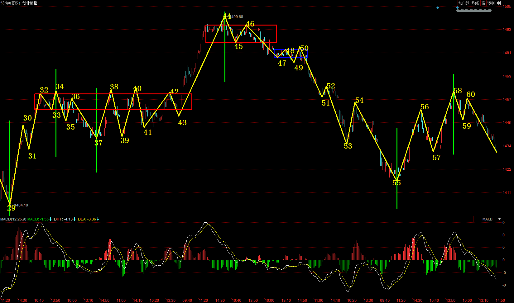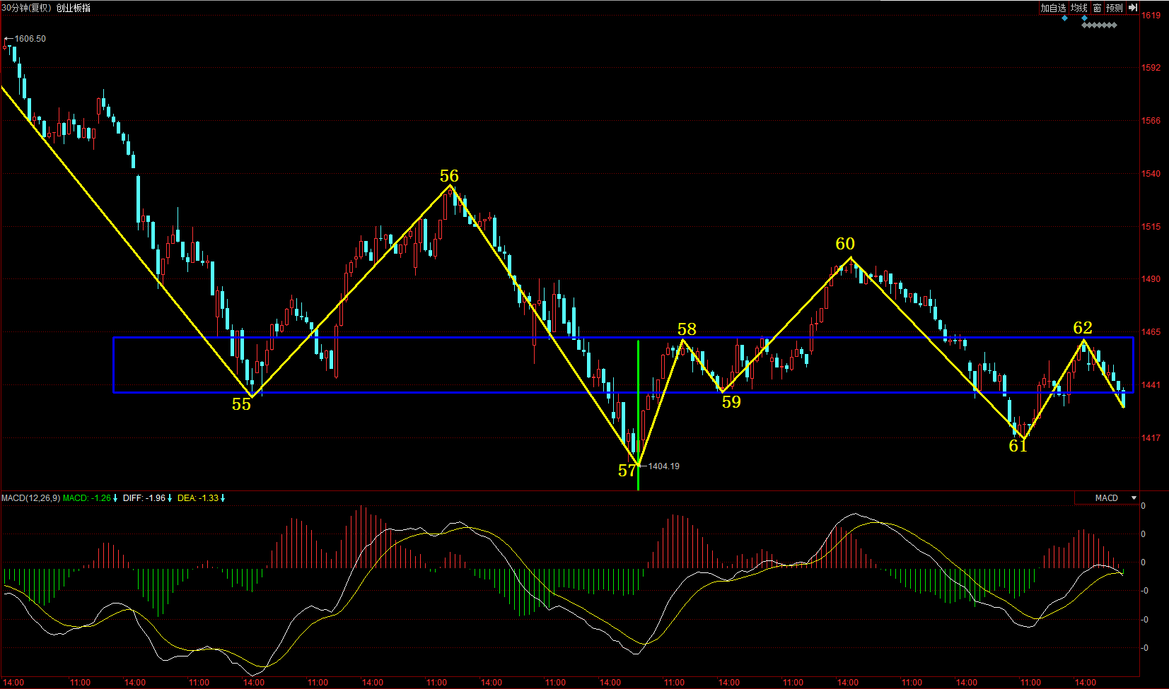 而對于創(chuàng)業(yè)板指,昨天我們提的兩個加倉條件一個都沒有滿足,30分鐘直接形成了向下一筆調(diào)整,5分鐘也沒有突破32-35中樞。當前創(chuàng)業(yè)板指也是弱勢的30分鐘中樞震蕩,圍繞55-58中樞反復震蕩。和上證指數(shù)類似,也存在兩種可能演變,一種就是繼續(xù)圍繞當前30分鐘中樞繼續(xù)震蕩。還有一種就是直接向下,形成日線級別的背馳,從而產(chǎn)生重要的階段調(diào)整低點。