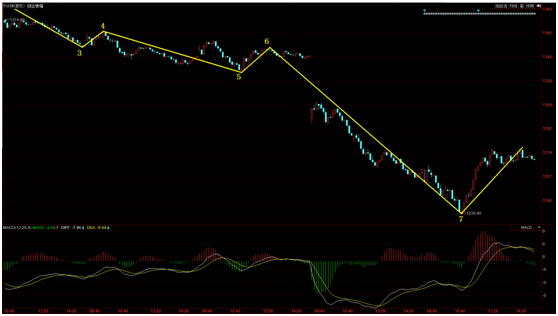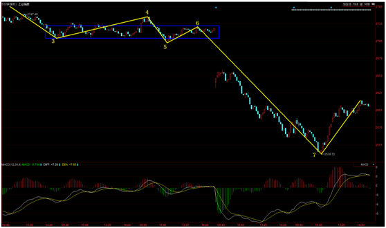 而從上證指數(shù)5分鐘圖來看,今天指數(shù)5分鐘7號點向上一筆反彈,實際是1分鐘級別的背馳導致的反彈,接下來5分鐘要么構筑一個新的5分鐘下跌中樞,之后中樞背馳終結或者中樞無背馳終結,還有一種就是小轉大終結,可以通過不創(chuàng)新低的二買來把握。
