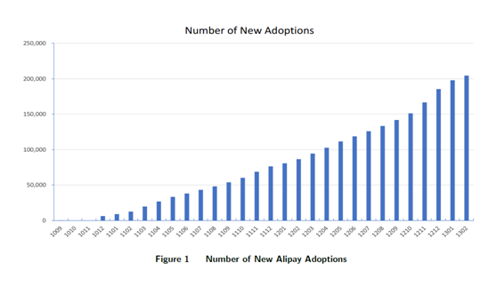 (圖1顯示,在觀察周期內(nèi),每月新接受支付寶的消費者數(shù)量。可以看到,從2010年10月開始,新接受支付寶的消費者總數(shù)穩(wěn)步增長。2013年,新接受支付寶的消費者人數(shù)增長至204547人,占樣本的13.3%。這表明移動支付正越來越普及。)