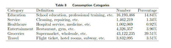 (上表顯示了移動支付交易過程中不同品類在全部交易的占比,其中教育14.84%,家政服務(wù)1.34%,醫(yī)療健康0.92%,娛樂 3.96%,食品百貨39.51%,旅行3.51%。)