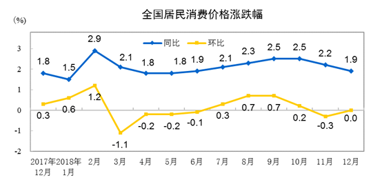 央廣網(wǎng)北京1月10日消息 國家統(tǒng)計(jì)局發(fā)布的數(shù)據(jù)顯示,2018年12月份,全國居民消費(fèi)價(jià)格同比上漲1.9%。其中,城市上漲1.9%,農(nóng)村上漲1.9%;食品價(jià)格上漲2.5%,非食品價(jià)格上漲1.7%;消費(fèi)品價(jià)格上漲1.7%,服務(wù)價(jià)格上漲2.1%。