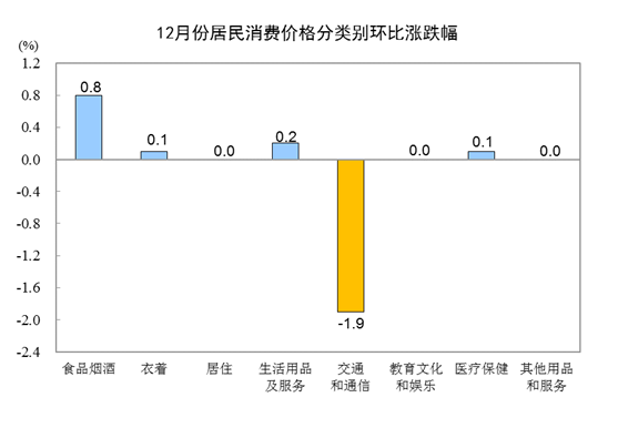 12月份,全國居民消費(fèi)價(jià)格環(huán)比與上月持平。其中,城市和農(nóng)村均與上月持平;食品價(jià)格上漲1.1%,非食品價(jià)格下降0.2%;消費(fèi)品和服務(wù)價(jià)格均與上月持平。