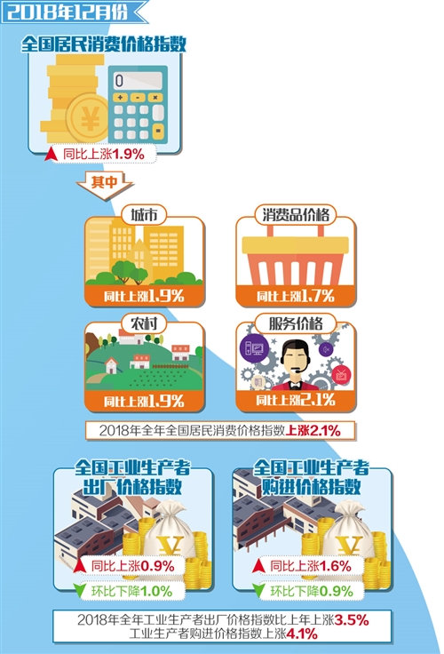 2019年1月10日,國家統(tǒng)計局發(fā)布了全國居民消費價格指數(CPI)和工業(yè)生產者出廠價格指數(PPI)數據。2018年全年,CPI同比上漲2.1%,同比漲幅比上年擴大0.5個百分點,完成了年初提出的“居民消費價格漲幅3%左右”預期目標;PPI同比上漲3.5%,漲幅比上年回落2.8個百分點。