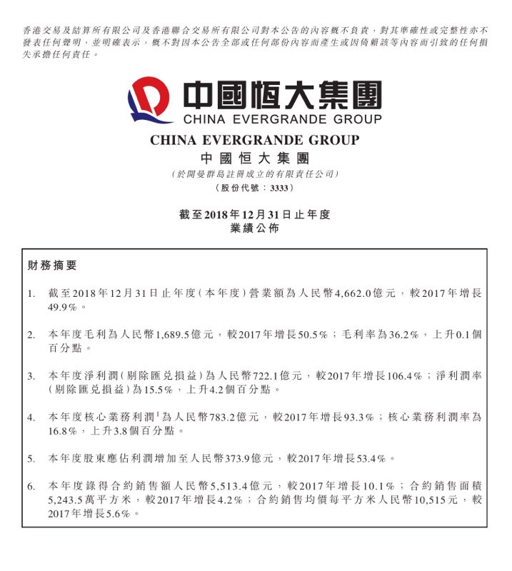 央廣網(wǎng)財(cái)經(jīng)3月26日消息(記者 易玨)2018年,房地產(chǎn)行業(yè)恰逢拐點(diǎn),行業(yè)整合趨勢(shì)加速,房企面臨“生死之戰(zhàn)”。3月26日,恒大發(fā)布2018年業(yè)績(jī):2018年凈利潤(rùn)722.1億元,同比增106.4%;核心凈利潤(rùn)783.2億元,同比增93.3%,均創(chuàng)行業(yè)有史以來(lái)最高紀(jì)錄。