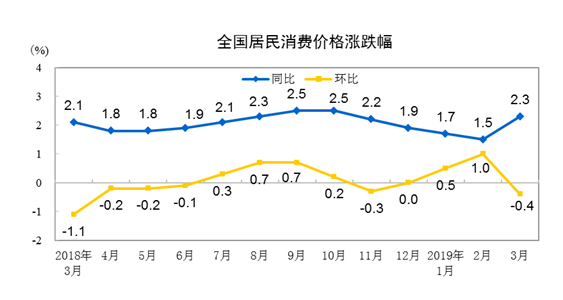 央廣網(wǎng)財(cái)經(jīng)4月11日消息 據(jù)國家統(tǒng)計(jì)局網(wǎng)站消息,2019年3月份,全國居民消費(fèi)價(jià)格同比上漲2.3%。其中,城市上漲2.3%,農(nóng)村上漲2.3%;食品價(jià)格上漲4.1%,非食品價(jià)格上漲1.8%;消費(fèi)品價(jià)格上漲2.4%,服務(wù)價(jià)格上漲2.0%。一季度,全國居民消費(fèi)價(jià)格總水平比去年同期上漲1.8%。