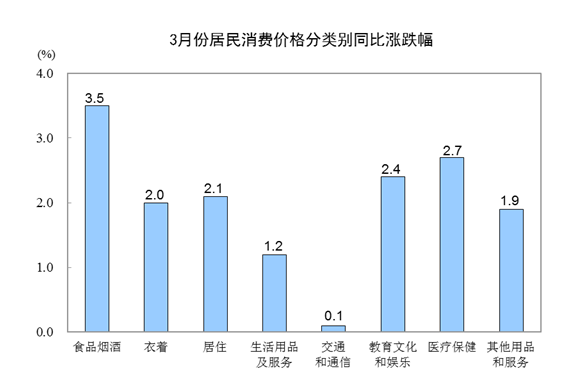 3月份,食品煙酒價(jià)格同比上漲3.5%,影響CPI(居民消費(fèi)價(jià)格指數(shù))上漲約1.04個(gè)百分點(diǎn)。其中,鮮菜價(jià)格上漲16.2%,影響CPI上漲約0.42個(gè)百分點(diǎn);鮮果價(jià)格上漲7.7%,影響CPI上漲約0.14個(gè)百分點(diǎn);畜肉類價(jià)格上漲4.7%,影響CPI上漲約0.20個(gè)百分點(diǎn)(豬肉價(jià)格上漲5.1%,影響CPI上漲約0.12個(gè)百分點(diǎn));禽肉類價(jià)格上漲4.0%,影響CPI上漲約0.05個(gè)百分點(diǎn);糧食價(jià)格上漲0.4%,影響CPI上漲約0.01個(gè)百分點(diǎn);雞蛋價(jià)格下降4.1%,影響CPI下降約0.02個(gè)百分點(diǎn);水產(chǎn)品價(jià)格下降3.0%,影響CPI下降約0.06個(gè)百分點(diǎn)。