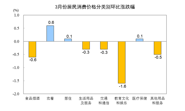 3月份,全國居民消費(fèi)價(jià)格環(huán)比下降0.4%。其中,城市下降0.4%,農(nóng)村下降0.3%;食品價(jià)格下降0.9%,非食品價(jià)格下降0.2%;消費(fèi)品價(jià)格下降0.1%,服務(wù)價(jià)格下降0.8%。
