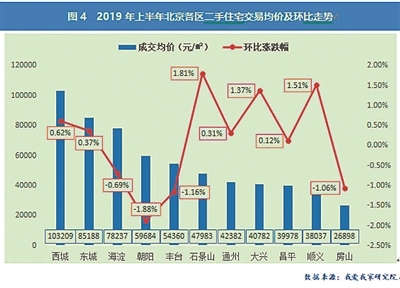 2019年上半年北京各區(qū)二手房住宅交易均價(jià)及環(huán)比走勢 數(shù)據(jù)來源:我愛我家研究院
