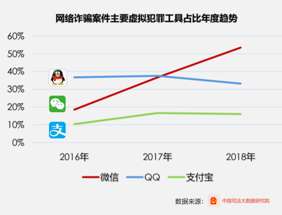 此前一天,最高人民法院發(fā)布《司法大數(shù)據(jù)專題報(bào)告之網(wǎng)絡(luò)犯罪特點(diǎn)和趨勢》,披露網(wǎng)絡(luò)詐騙案件主要虛擬犯罪工具及占比趨勢。數(shù)據(jù)顯示,利用支付寶進(jìn)行的網(wǎng)絡(luò)詐騙案占比在2017年出現(xiàn)拐點(diǎn),呈現(xiàn)下降趨勢。