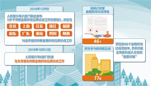 2018年12月份,人民銀行等6部門聯(lián)合發(fā)布《關(guān)于開展金融科技應(yīng)用試點工作的通知》,決定在北京市、上海市、江蘇省、浙江省、福建省、山東省、廣東省、重慶市、四川省、陜西省(10省市)組織開展金融科技應(yīng)用試點工作。2019年10月12日,人民銀行等6部門批準在北京首先開展金融科技應(yīng)用試點工作,12月5日,試點啟動。