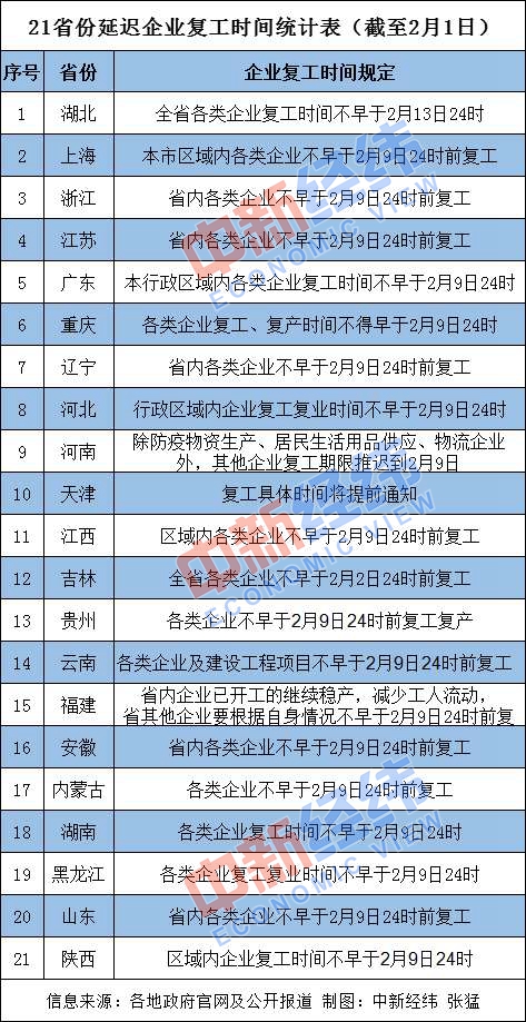 截至發(fā)稿時,湖南、廣東、上海、重慶、江蘇、浙江、河南、河北、山東、安徽、貴州、云南、福建、遼寧、內(nèi)蒙古等19省份區(qū)域內(nèi)企業(yè)復(fù)工時間不得早于2月9日24時,吉林不得早于2月2日24時,湖北不得早于2月13日24時。
