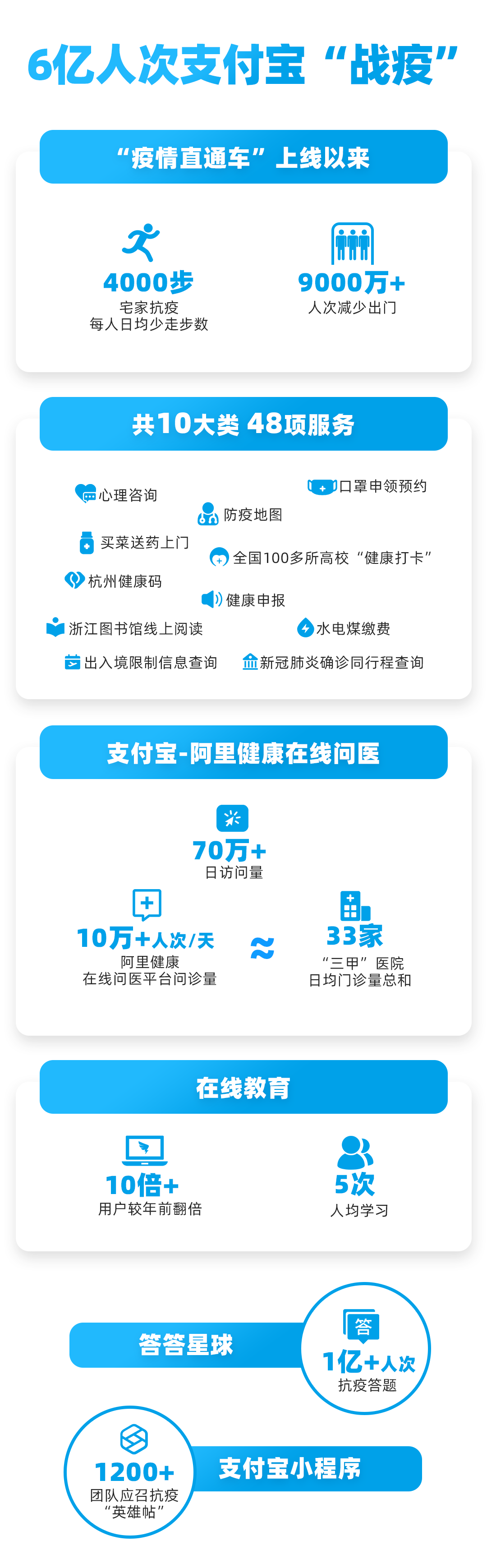 支付寶今天公布的數(shù)據(jù)顯示,自1月27日推出“疫情服務直通車”以來,截至目前,已有6億人次在支付寶使用疫情信息查詢、在線問診、買菜送藥上門、健康申報、改簽行程、愛心捐贈、同行程查詢等10大類、48項服務。初步統(tǒng)計,至少減少出門次數(shù)9000萬次,每天人均少走4000步。