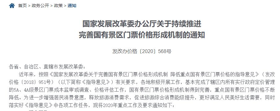央廣網(wǎng)北京8月11日消息 據(jù)國(guó)家發(fā)改委網(wǎng)站消息,國(guó)家發(fā)改委日前發(fā)布《關(guān)于持續(xù)推進(jìn)完善國(guó)有景區(qū)門(mén)票價(jià)格形成機(jī)制的通知》(下稱《通知》)!锻ㄖ贩Q,繼續(xù)推動(dòng)景區(qū)門(mén)票降價(jià),今年下調(diào)景區(qū)門(mén)票價(jià)格應(yīng)考慮新冠肺炎疫情影響,結(jié)合當(dāng)?shù)貙?shí)際,堅(jiān)持遠(yuǎn)近結(jié)合,既要有利于推動(dòng)旅游業(yè)發(fā)展,又能保障景區(qū)正常運(yùn)轉(zhuǎn)。