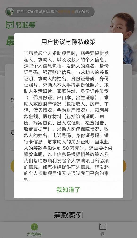 經(jīng)記者體驗(yàn),在下載輕松籌APP后,將彈出一份《用戶協(xié)議與隱私政策》。該文件稱,輕松籌APP將通過注冊(cè)成為用戶、發(fā)起個(gè)人求助項(xiàng)目、個(gè)人捐贈(zèng)服務(wù)、個(gè)人求助項(xiàng)目證明以及授權(quán)產(chǎn)品權(quán)限以上六大過程中收集用戶信息。值得注意的是,在發(fā)起個(gè)人求助項(xiàng)目時(shí),用戶同意并授權(quán)輕松籌可以收集并使用的信息包括:個(gè)人身份證件、家庭住址、醫(yī)療材料和醫(yī)療保障情況、收款人銀行卡賬號(hào)等敏感度頗高的隱私信息。