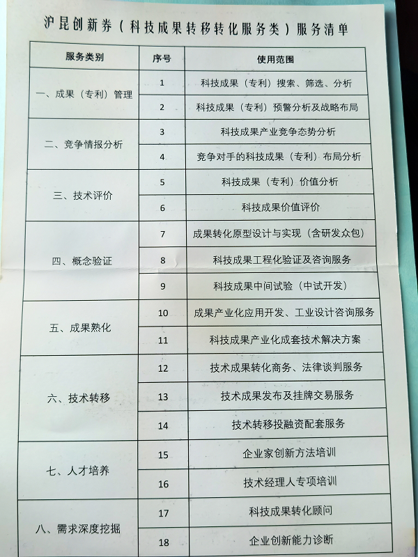 滬昆創(chuàng)新券(科技成果轉(zhuǎn)移轉(zhuǎn)化服務(wù)類)服務(wù)清單。(央廣網(wǎng)記者梁爽 攝)